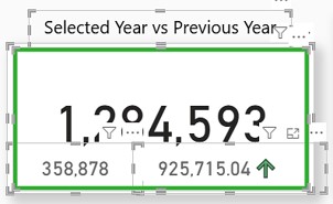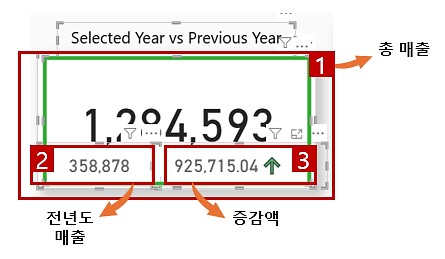 기존 카드 시각적 개체를 사용하여 총 매출 및 전년 동월 매출과 그 차이값 및 증감 여부를 표시하려면 각각 하나씩 총 3개의 카드를 사용해야 했는데요. 이러한 방식으로 여러 지표를 동시에 비교하기가 어려웠습니다. 각각의 카드에 대해 개별적인 포맷팅과 배치를 해야하기 때문에 비효율적이었으며 디자인적인 통일성을 갖추려면 많은 수작업을 필요로 하기 때문에 사용에 불편함이 따랐습니다.