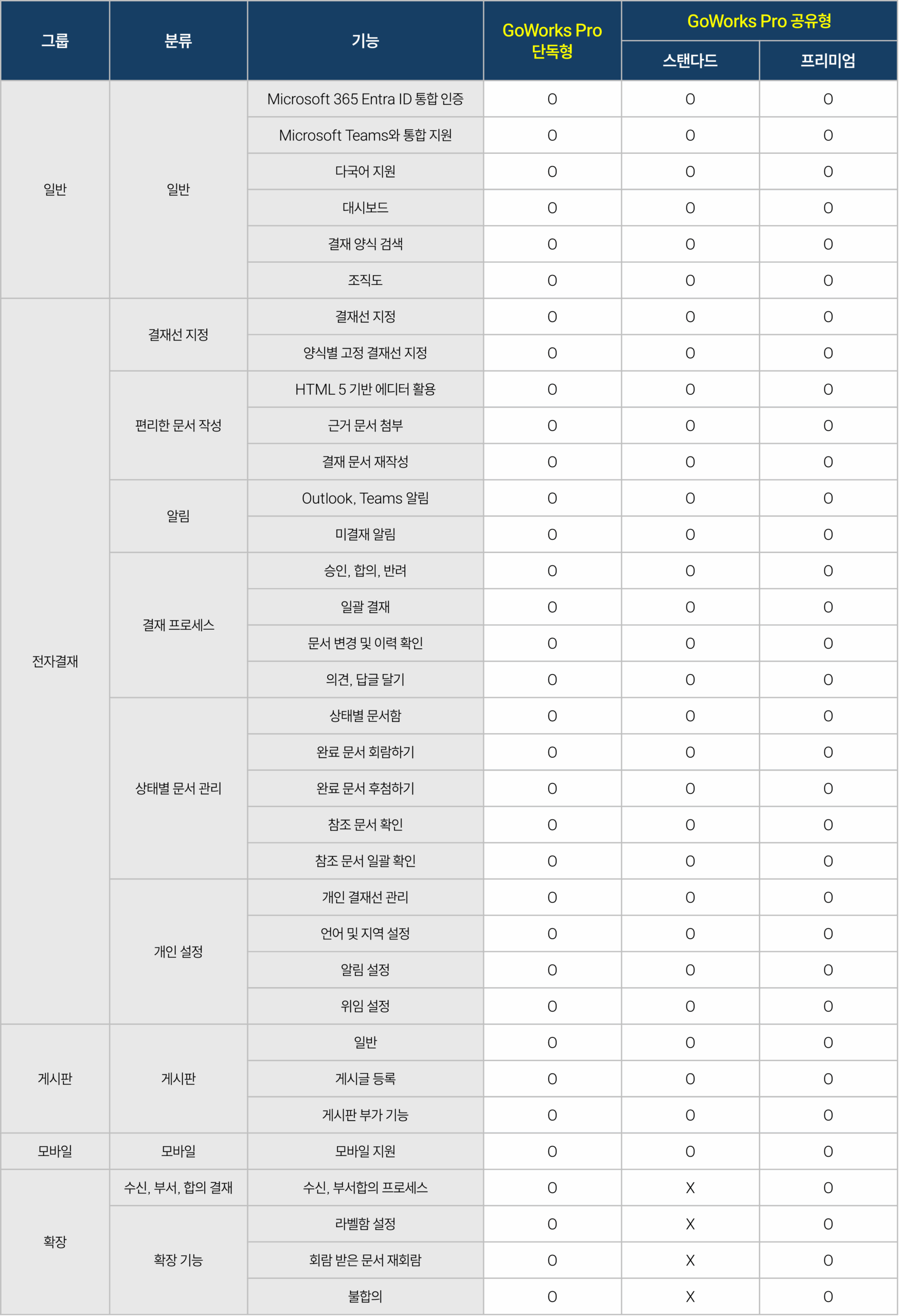 [표 2] GoWorks Pro 단독형 vs. 공유형 제공 기능 비교 (출처 : 고우아이티)