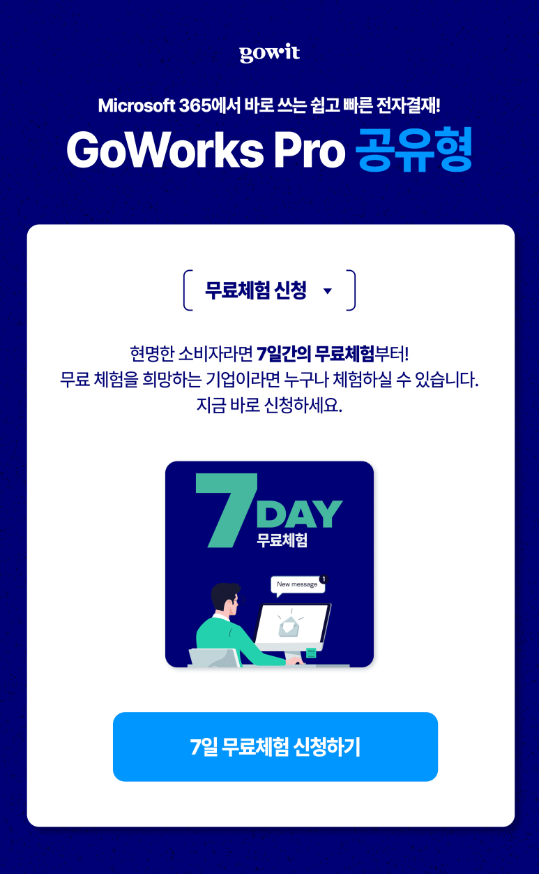 그래서 Microsoft 365 기반 전자결재 도입에 대해 관심을 가진 기업이라면 GoWorks Pro 공유형 무료체험을 꼭 해보시길 강권합니다. 무료체험을 통해 전자결재의 실제 작동 원리를 이해하고 기업에 반드시 필요한 서비스인지 가늠해볼 수 있을 것이며, 블로그, 브로셔, 제품 소개서의 단순 소개가 아닌 실제 사용 경험에 기반한 진짜 정보와 경험을 획득하는 좋은 기회가 될 것입니다. 또 구매 계획 실행 전 미리 사용해 봄으로써 구매 리스크를 최소화하거나 검토 제품 간 비교와 선택의 기준 마련에도 도움이 될 것이라 확신합니다.