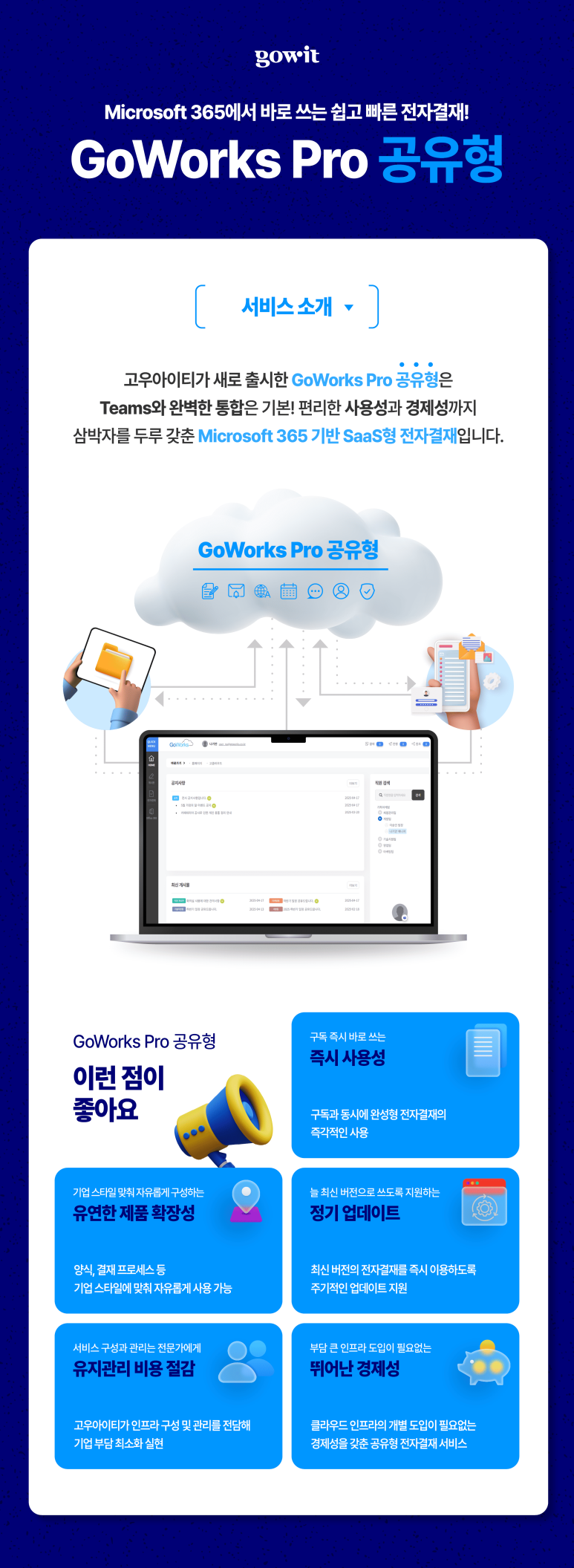 최근 고우아이티는 Microsoft 365 기반 SaaS형 전자결재 서비스인 ‘GoWorks Pro 공유형’을 새롭게 선보였습니다. 편리한 기능은 그대로 유지하면서 즉시 사용성을 제공하고, 경제성을 위해 고우아이티의 클라우드 자산과 서비스 관리를 제공하는 방식의 전자결재 모델을 새롭게 추가한 것입니다.