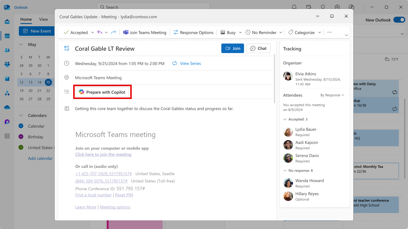 >> 회의에 대한 요약을 할 수 있는 경우 사용자는 모임 초대에 Copilot으로 준비 단추를 볼 수 있습니다.