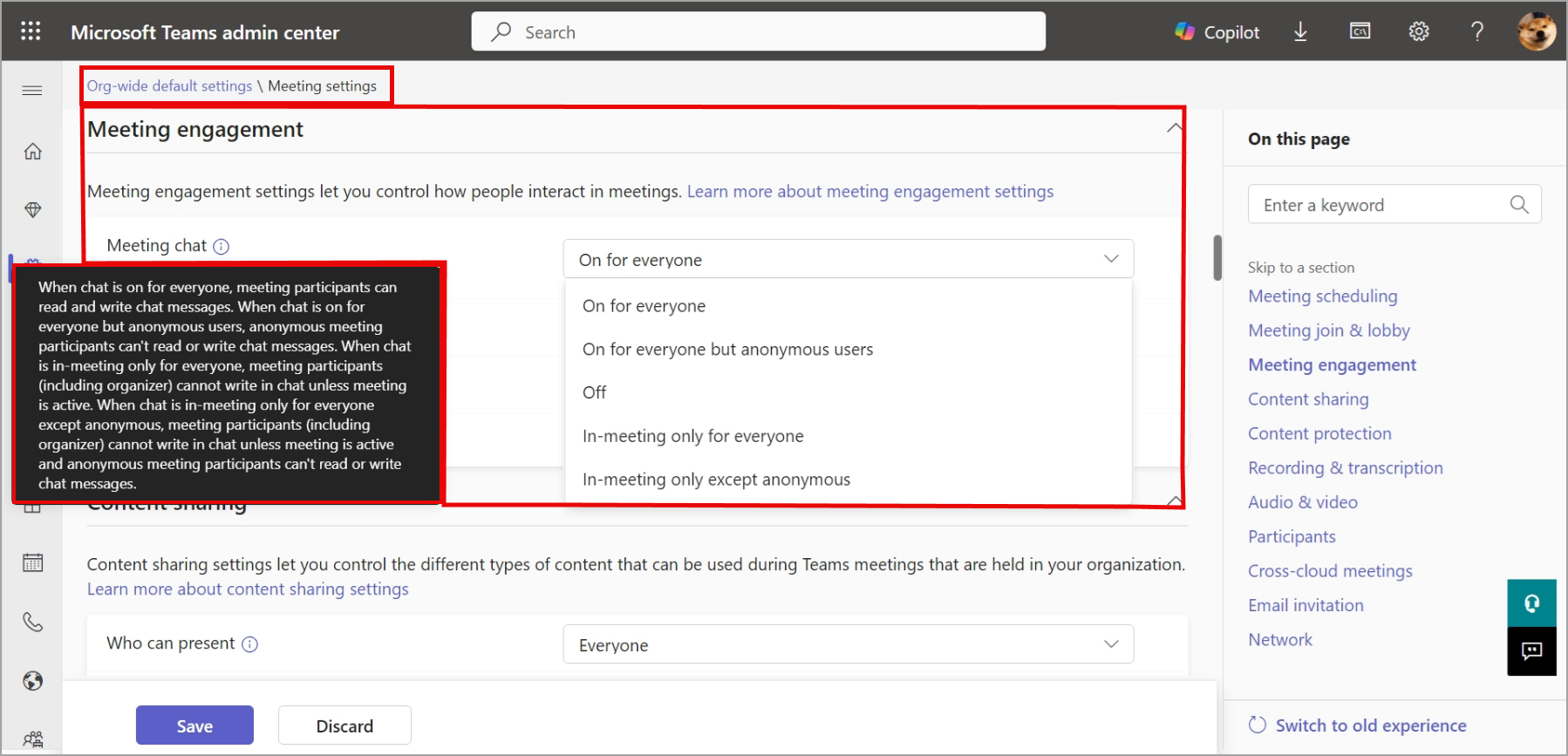 이처럼 관리자는 모임 내 전용 옵션을 선택하여 테넌트에서 특정 사용자가 주최한 회의일 경우, 회의 참가자가 회의 전 또는 회의가 끝난후에 회의 채팅에서 메시지를 보낼 수 있는 기능을 비활성화 할 수 있습니다. 회의 중 전용 옵션 중 하나를 선택하면 참가자는 이전 채팅 기록을 읽을 수 있지만 회의가 활성화된 동안에만 회의 채팅에서 메시지를 보낼 수 있습니다.