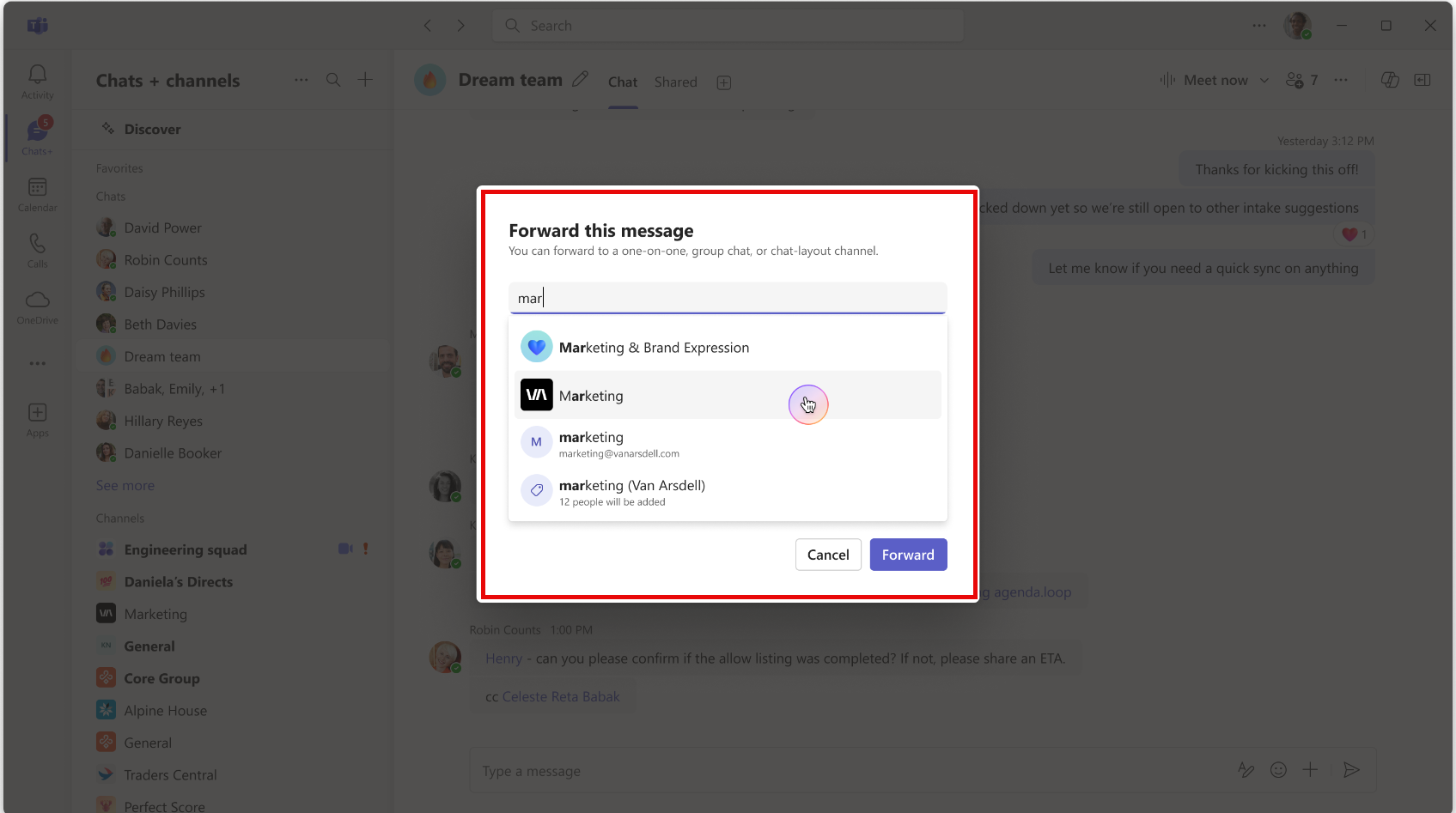 >>사용자는 이 메시지 전달 대화 상자에서 채팅 또는 채널을 선택할 수 있습니다. 사용자 선택 도구에 채널을 포함시키는 것은 데스크톱의 메시지 전달 대화 상자에 새로 추가된 기능입니다.