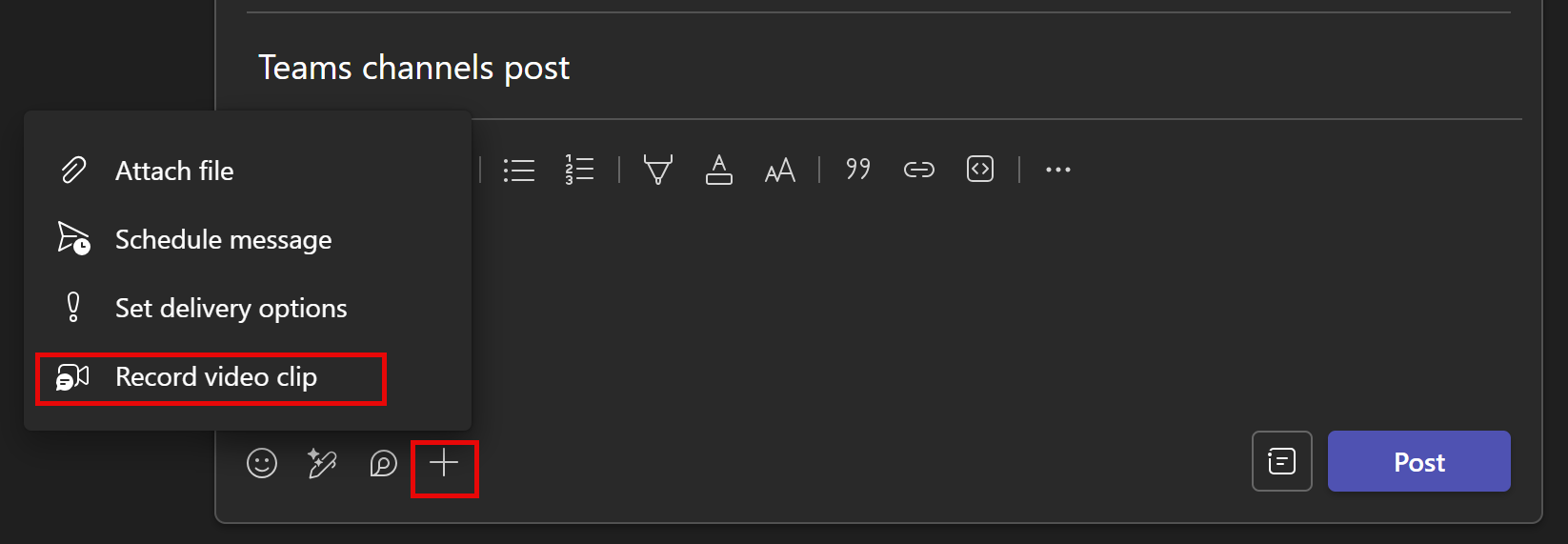 >> (비디오 클립 녹화 옵션은 Teams 채팅에만 존재하며)채널에서 새로운 기능을 사용하려면 사용자는 게시물이나 답장을 작성하는 상자로 이동하여 [+]기호(작업 및 앱 메뉴)를 선택 후 새 비디오 클릭 녹화 옵션을 선택하면 됩니다.