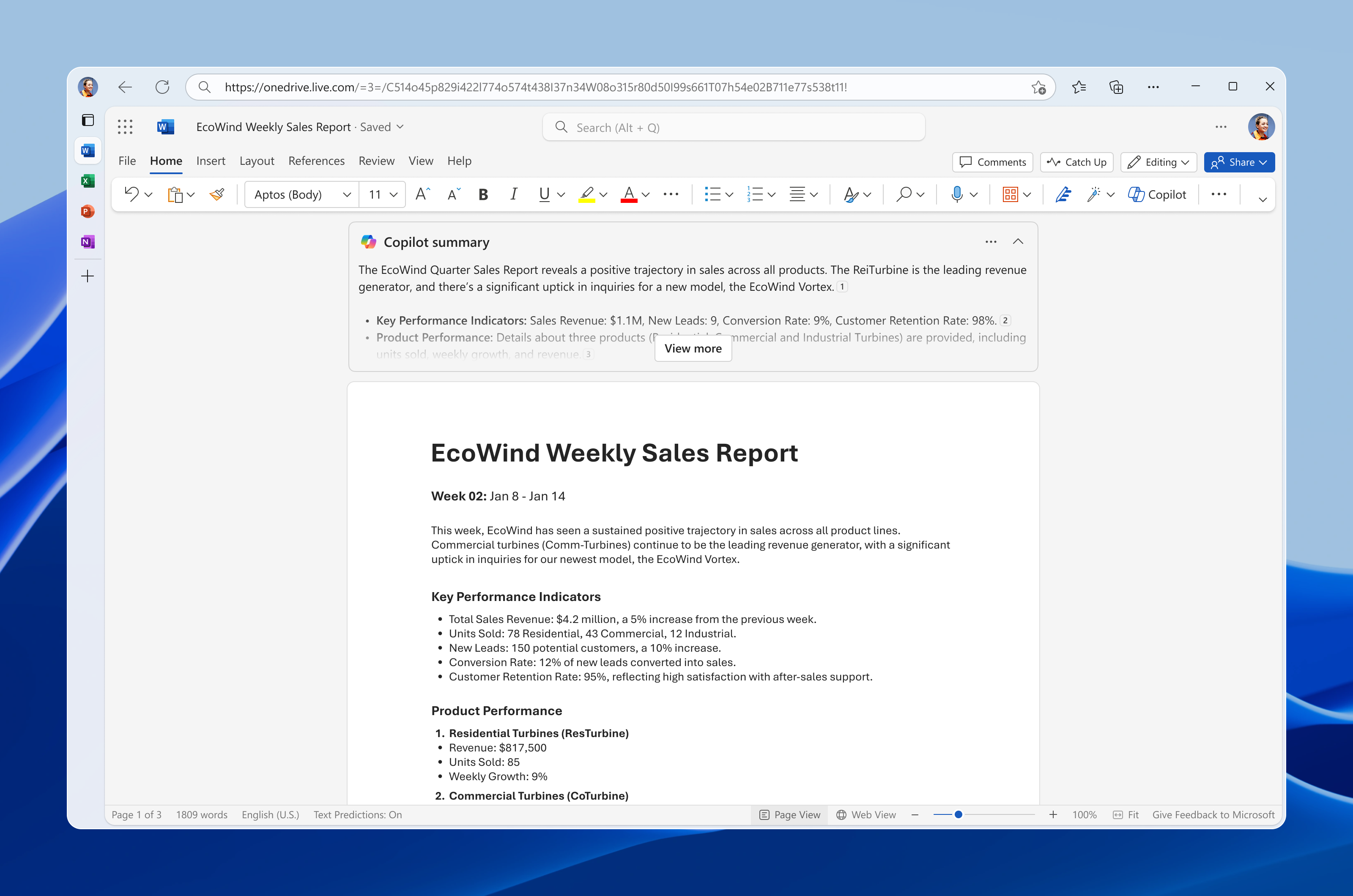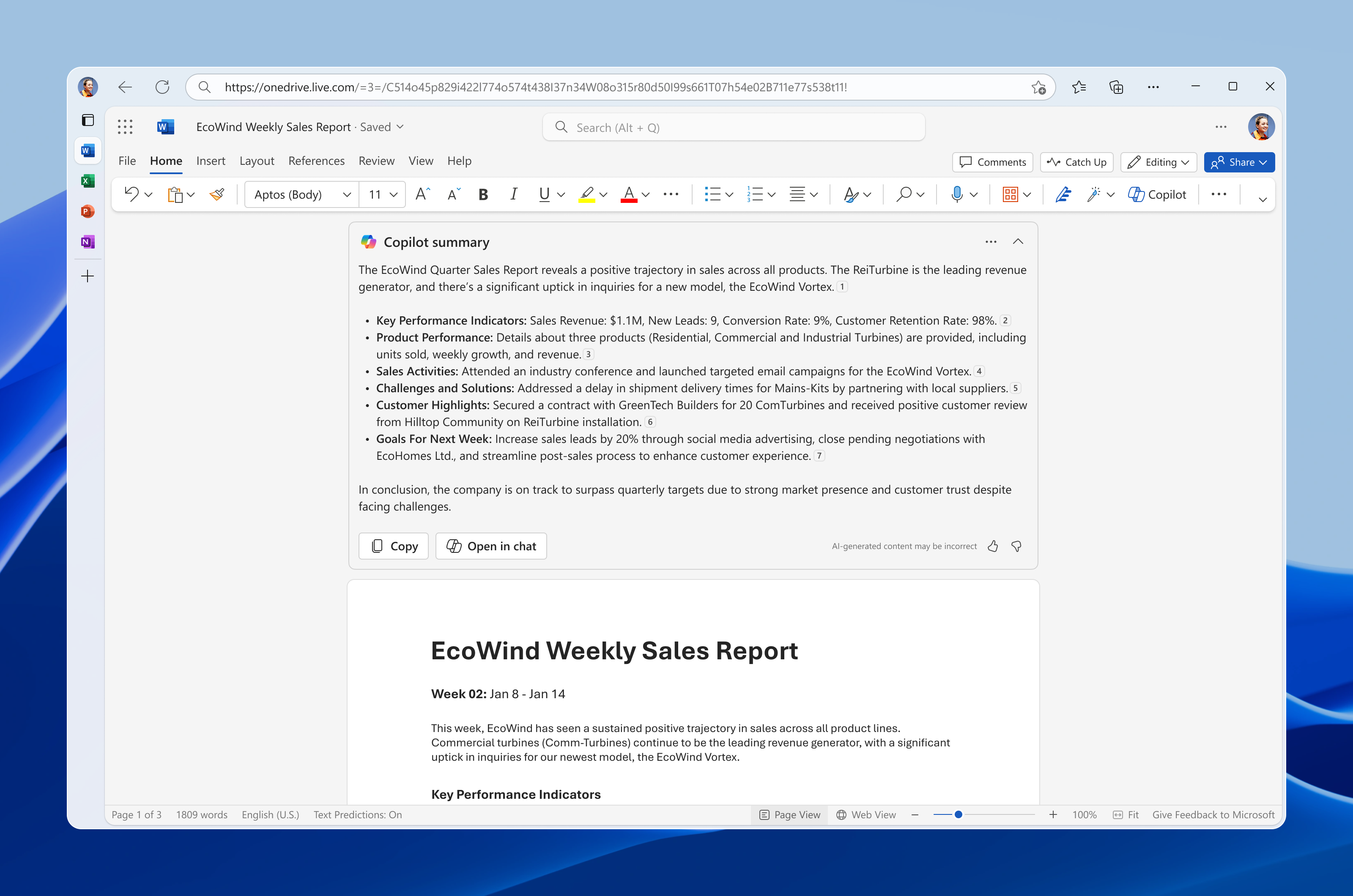 Microsoft 365의 Copilot for Word를 열 때 문서 요약이 자동으로 생성하도록 업데이트 됩니다. 사용자가 워드(Word) 문서를 열면 워드 문서 상단의 창에 요약을 생성합니다. 요약을 숨기거나 Copilot 채팅창을 열어 문서에 대한 특정 질문을 할 수도 있습니다.