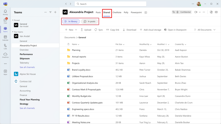 업데이트 후에도 사용자는 채널에 연결된 Microsoft SharePoint 문서 라이브러리의 파일 및 폴더로 계속 작업할 수 있습니다. 파일 탭의 모든 기존 기능은 채널의 공유 탭에 있는 라이브러리 보기에서 사용할 수 있습니다. 공유 탭의 게시물 보기에는 채널 게시물에는 채널 게시물에 공유된 모든 파일과 링크가 표시됩니다.