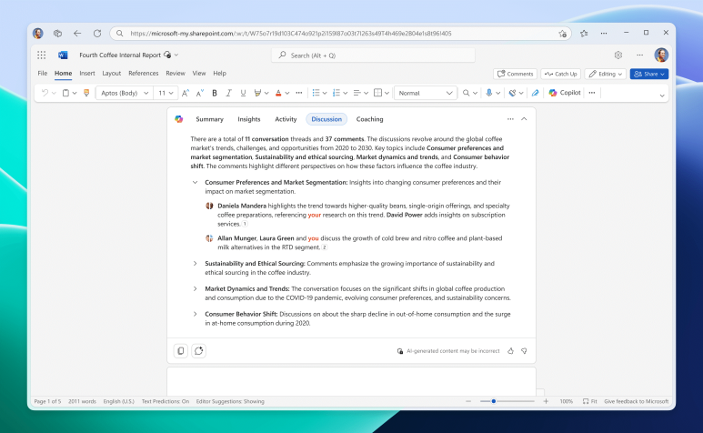 공동 작업하며 문서를 이해하고 작성하고 다듬는 데에는 많은 시간과 노력이 필요합니다. 이제 Microsoft Copilot은 실시간으로 업데이트되는 동적 문서 스냅샷을 포함하여 문서 상단에 명확한 요약, 주요 정보(인사이트), 활동 및 댓글 하이라이트, 코칭 제안 등을 제공할 예정입니다. 학습 또는 프로젝트를 관리 중이거나 글쓰기 도우미가 필요한 경우 Copilot을 사용하면 집중력을 유지하고 중요 업무에 더 집중할 수 있도록 도와 업무를 더 효율적으로 관리할 수 있도록 도와줍니다.