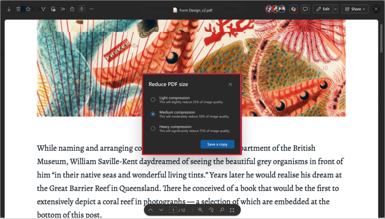 Microsoft SharePoint 및 OneDrive는 새롭게 PDF 압축 기능을 도입하여 사용자가 세 가지 압축 수준으로 PDF 파일 크기를 줄일 수 있도록 지원할 예정입니다. 사용자는 이 새로운 압축 기능을 사용하여 웹용 Microsoft OneDrive 또는 Microsoft SharePoint에 저장된 PDF 파일 크기를 줄일 수 있습니다. 사용자는 최대 300MB의 PDF를 압축할 수 있으며, PDF 파일을 압축하려면 다음과 같이 진행할 수 있습니다.