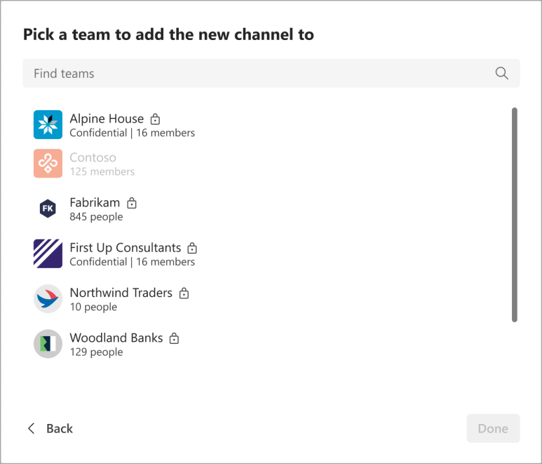 이전에는 채널이 표시된 팀만 호스트 팀 목록에 포함되었는데요. 이제 새 채널을 만들 때 크리에이터는 해당 팀에서 채널을 만드는 데 필요한 권한이 있는 경우 채널이 표시되지 않은 팀을 포함하여 채널을 호스트할 팀을 선택할 수 있습니다. 새 항목 드롭다운에서 채널을 만드는 관리자 또는 사용자는 채널을 호스팅할 모든 팀을(팀 및 채널 목록에 채널이 표시된 사용자의 팀 뿐만 아니라) 선택할 수 있습니다. 채널 생성 과정에서 [새 채널을 추가할 팀 선택]이라는 창에 알파벳 순으로 표시됩니다.