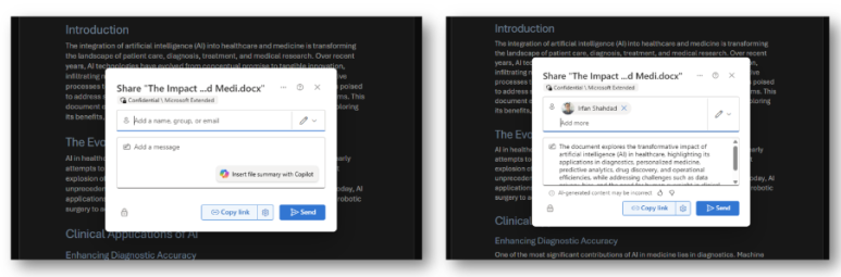 웹을 통해 Word, PowerPoint, Excel, PDF, 이미지(.png, .jpeg) 또는 텍스트(.txt) 파일을 공유할 때 사용자는 공유 대화 상자 내의 Copilot 버튼을 클릭하여 파일 요약을 생성할 수 있습니다. 생성된 요약은 수신자에게 전송되는 공유 알림 이메일에 자동으로 포함됩니다.