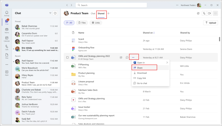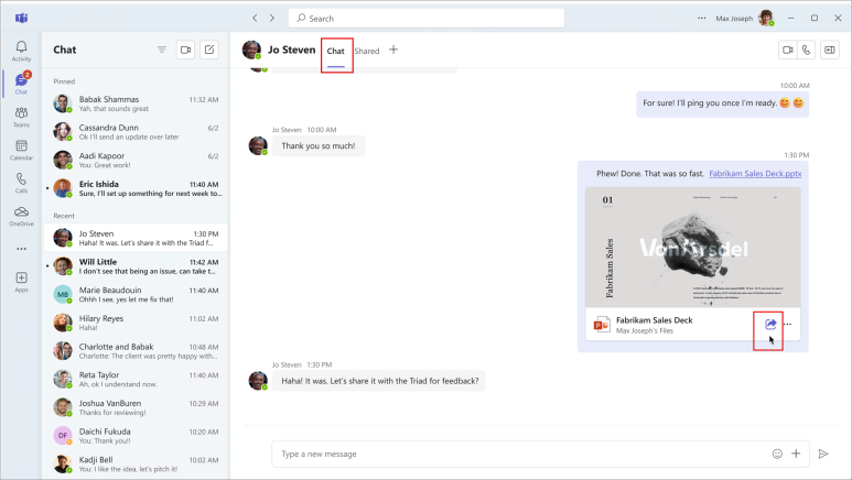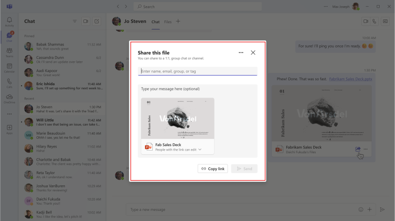 이제 사용자는 채팅 대화, 채팅 공유 탭 또는 채널 게시물의 파일을 더 적은 클릭으로 손쉽게 1:1 채팅, 그룹 채팅 또는 채널에 공유할 수 있습니다. 파일이 공유되면 해당 권한이 유지되어 받는 사람이 적절한 액세스 권한을 가질 수 있습니다. 사용자는 @mention 수신자와 함께 공유 파일 및 메시지를 포함할 수 있습니다.