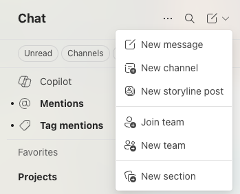 5. Microsoft Teams : 채팅 및 채널 목록 상단 “새 항목” 메뉴에서 빠르게 새 채널 만들기