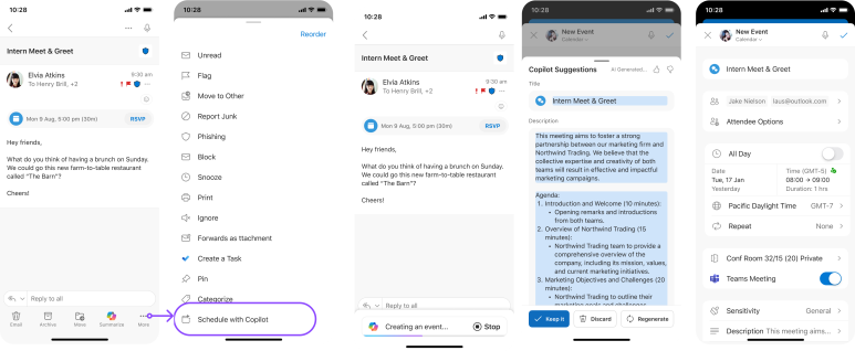 Copilot은 이메일 대화에서 직접 회의를 예약할 수 있게 해줍니다. 새로운 일정 옵션을 통해 이메일 스레드와 대화를 분석하고 자동으로 회의 초대장을 생성하여 제목, 의제를 미리 작성하고 이메일 스레드를 첨부합니다. (이메일의 참석자가 초대에 추가되어 빠르게 검토, 편집 및 전송할 수 있습니다.) 업데이트 후 사용자는 지원되는 이메일 스레드에서 Copilot(코파일럿) 일정 옵션을 볼 수 있으며 이 기능은 수동 단계를 줄이고 모임 세부 사항의 일관성을 향상시켜 회의 생성(모임 만들기)을 간소화하도록 돕습니다.