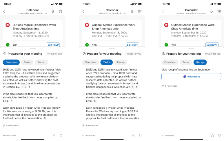 Copilot(코파일럿)은 모바일로 기능을 확장하여 사용자가 이동 중에도 주요 콘텐츠를 요약하여 회의를 준비할 수 있도록 지원합니다. Copilot을 활용하여 이메일, 문서, 작업 항목 및 이전 미팅 요약과 같은 주요 미팅 관련 콘텐츠를 신속하게 요약 가능하기 때문에 모바일 사용자는 상황에 맞게 정보를 얻을 수 있고 언제 어디서나 이동 중에도 빠르게 모임을 준비할 수 있습니다.